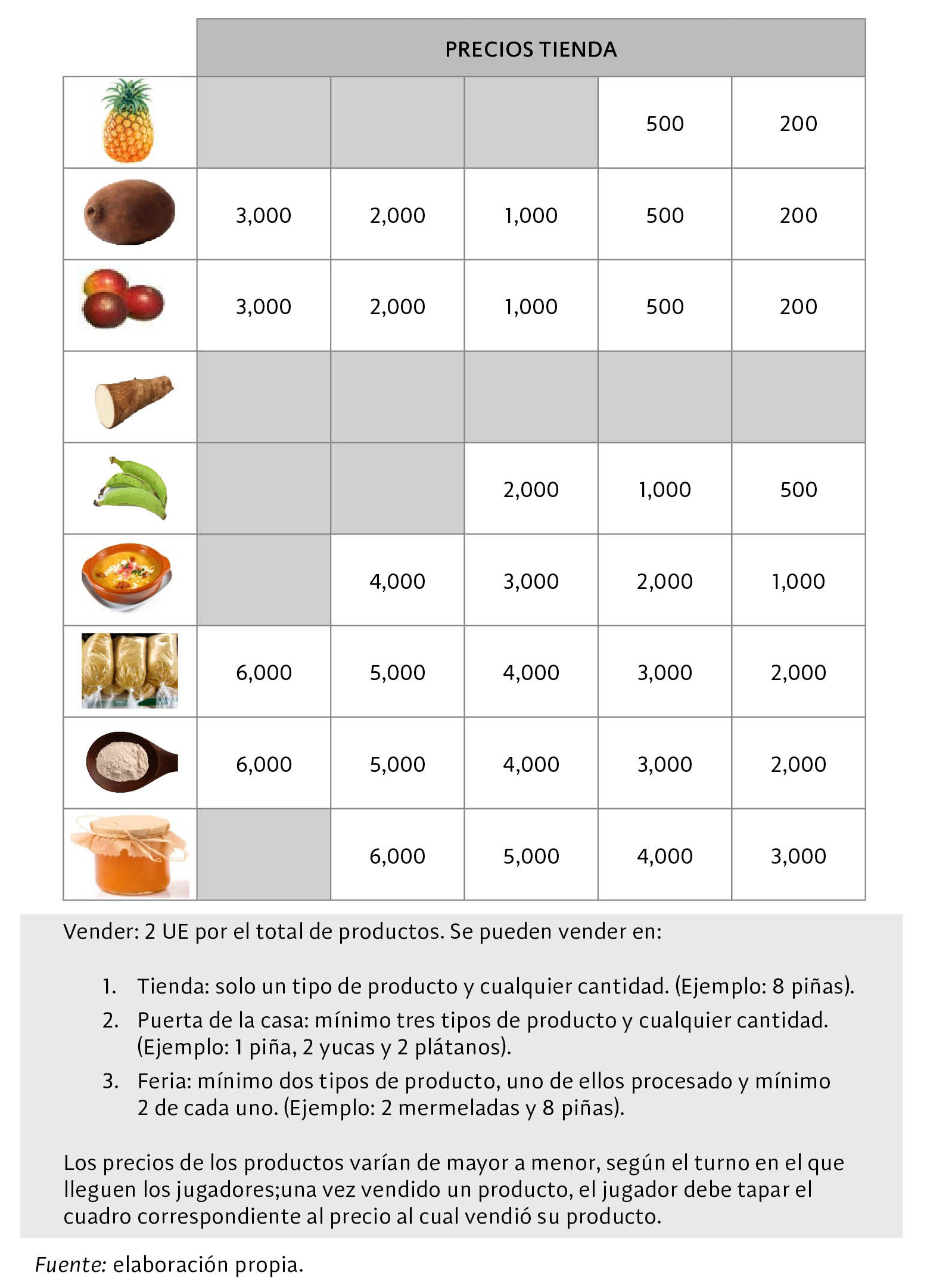 Las acciones de producción y transformación se realizan de forma particular en el tablero de cada jugador; y las acciones de comercialización se efectúan en tableros colectivos, donde los precios de compra-venta de los productos se modifican a medida que los productos son ofrecidos por cada jugador en estos lugares. Los tres puntos de comercialización —tienda, puerta de la casa y feria— tienen requisitos diferentes en cuanto a tipo de producto y cantidad, como se muestra en el esquema 2. Los precios de los productos son menores en la tienda, medios en la puerta de la casa y mayores en la feria. Los jugadores tienen la posibilidad de cambiar productos o venderlos entre ellos, una sola vez, solo cuando sea su turno, y sin gastar UE. Los alimentos cosechados que no se venden antes del final de cada ciclo se pierden. Los productos procesados y los cultivados no se pierden al final de cada ciclo. Después de cosechada la chagra, esta queda enmontada, y antes de volver a sembrarla se debe limpiar. Al final, los jugadores obtienen puntos por 1) diversidad de especies sembradas (1 punto por especie), 2) herramientas de transformación (5 puntos cada una), y 3) ventas en tiendas (2 puntos), en la puerta de la casa (5 puntos) y en ferias (10 puntos).