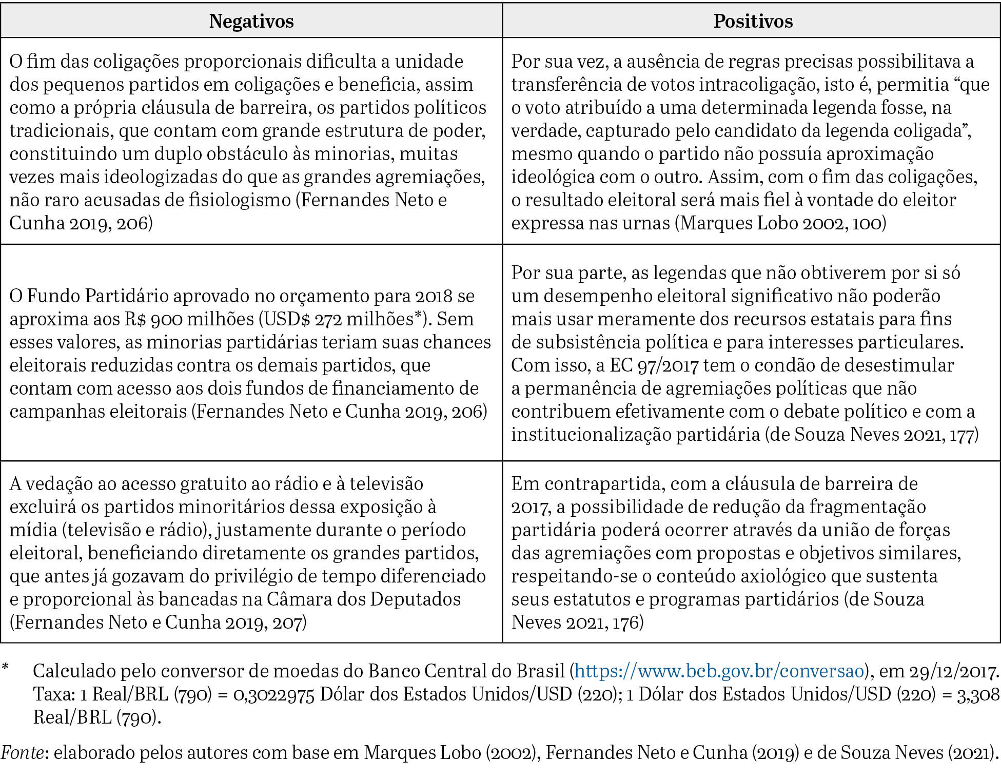 O ponto positivo dessa redução defendido por alguns especialistas, como Guilherme Russo, do Centro de Política e Economia do Setor Público da Fundação Getúlio Vargas, é que a diminuição dos partidos favorece ao eleitor na sistematização deles conforme as ideias que representam (DIAP 2020). Negativamente, soma-se a isso o fato de que, em 14 cidades brasileiras, na legislatura de 2021 a 2024, haverá vereadores de apenas um partido, sendo que, em 12 delas, esses vereadores serão do mesmo partido do prefeito (Vasconcelos 2020). Abaixo, encontra-se, de forma sistemática, o comparativo sobre os efeitos da proibição à formação das coligações, segundo Marques Lobo (2002), Fernandes Neto e Cunha (2019), e de Souza Neves (2021).
