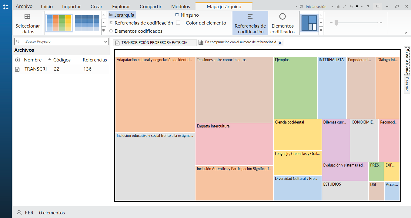Para analizar la información recogida se tomó la transcripción de la entrevista, luego se llevó a cabo un proceso de codificación en el que se identificaron fragmentos relevantes relacionados con las dimensiones de estudio. En la ilustración 1 se muestra la comparación de las referencias de codificación y los códigos que emergieron dentro del análisis. Cada fragmento se codificó de acuerdo con temas y patrones emergentes que conducían a distinguir ideas clave, tensiones y actitudes de la profesora. Posteriormente, se agruparon las ideas a partir de los códigos identificados para construir narrativas. Esto se realizó mediante el rescate de fragmentos representativos de la entrevista que pudieran ilustrar de manera clara las concepciones de Patricia en cada dimensión. Se extrajeron citas textuales para sustentar cada narrativa y reflejar con fidelidad su discurso.