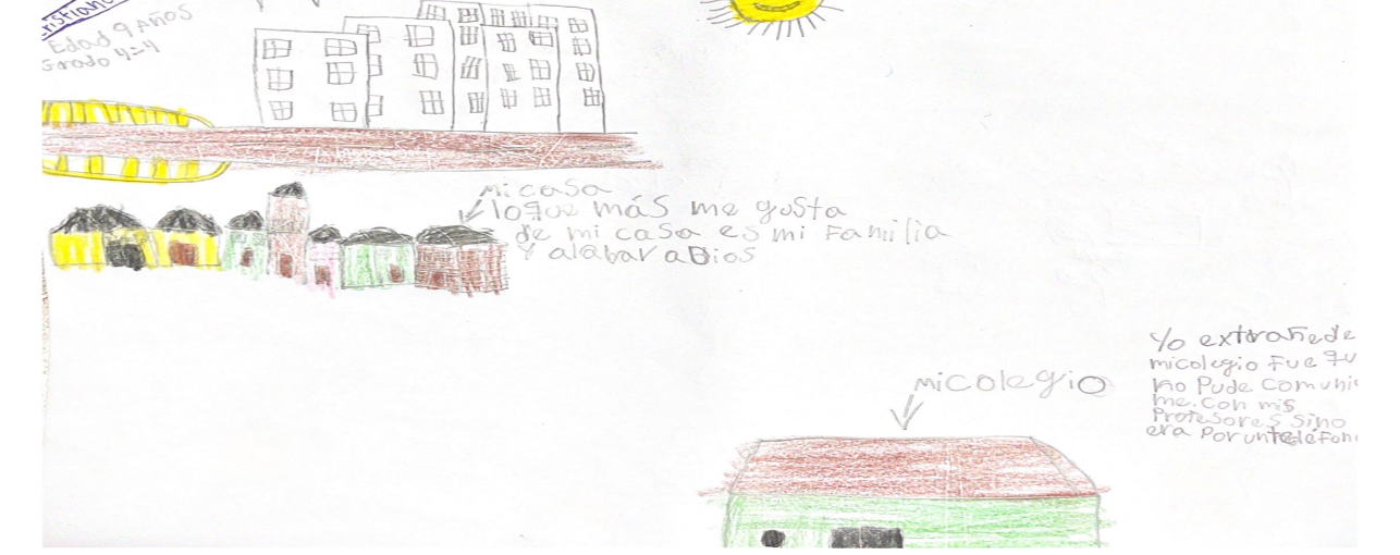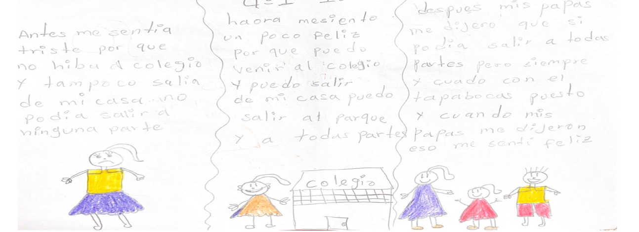 Triste, igual no ha cambiado nada, ahora tengo computador. Niño de 9 años, en el antes dice que se fracturó el brazo y casi se parte los dientes, venía al colegio y jugaba con los amiguitos; el ahora, no venimos al colegio utilizamos tapaboca al entrar al colegio y tenemos que quedarnos quietos y echarnos alcohol en las manos; el después de la pandemia, vamos a venir todos los días al colegio, vamos a salir a descanso, sin tapaboca, vamos a poder salir. . |