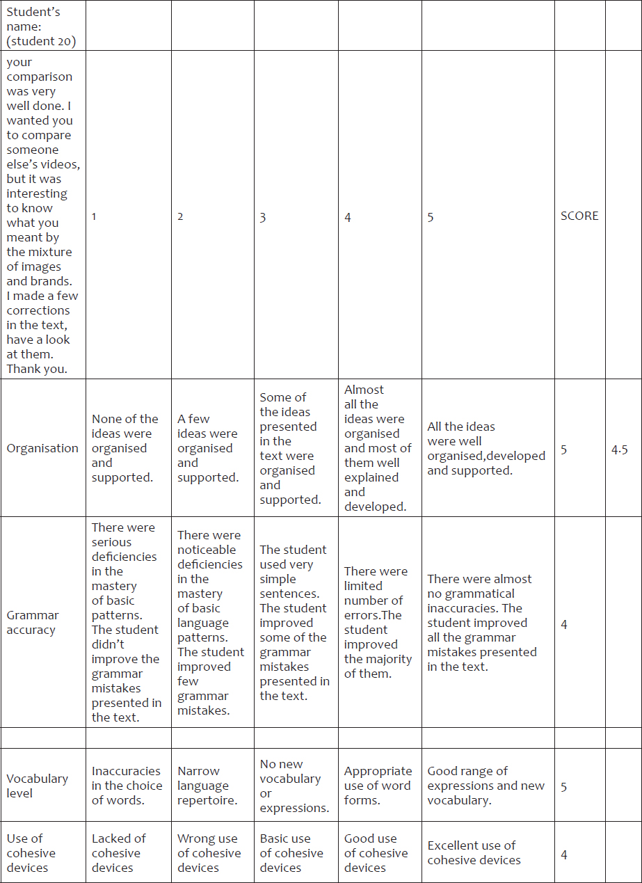 Una vez realizaban el video, los estudiantes nuevamente hacían la integración de habilidades de escritura, gramática y vocabulario aprendidos anteriormente y escribían un reporte del proceso que habían tenido ellos en la realización del video. Además, escribían un reporte de comparación de dos videos de sus compañeros. Estos dos ejercicios daban cuenta de los temas de escritura estudiados en ese momento como parte del programa del curso; por ejemplo, reportes de comparación. En este tipo de actividades se veía el trabajo de reflexión desde otra perspectiva, esta vez de los pares, a través de los comentarios que los alumnos hacían acerca de los videos de sus compañeros y de otros trabajos (ver los anexos 5 y 6)