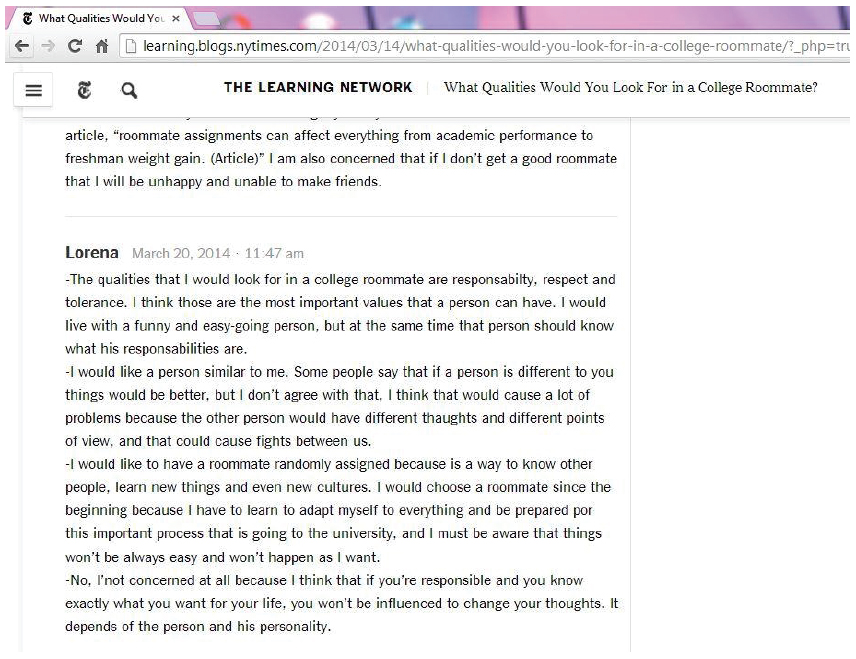 Como cierre de esta etapa, anexo el escrito de una de mis estudiantes que fue publicado por el Learning Network del The New York Times, en marzo del 2014. La estudiante 5 tuvo que seguir los parámetros de publicación que ellos tenían y debía dar respuesta a los temas que planteaban. La herramienta virtual le permitió a la estudiante ir más allá de los límites del salón de clases (ver el anexo 2).
