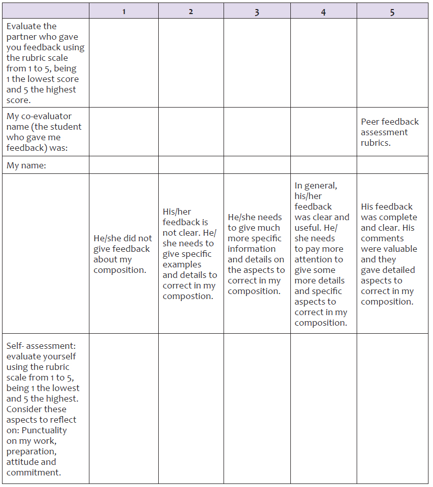 Retroalimentación entre pares: desde el inicio de las primeras experiencias de retroalimentación entre pares, me di cuenta de que los estudiantes eran capaces de realizar una evaluación tan valiosa como la que podían obtener por parte del profesor. Algunos tenían en cuenta el esfuerzo realizado, e incluso pequeños detalles del trabajo del compañero que seguramente el profesor no hubiera notado. En el anexo 7 presento algunos ejemplos, después de haber escuchado el audio de una compañera, o al haber revisado un texto escrito de autobiografía, o con respecto a videos cortos realizados como tareas. En esos ejemplos se evidencian las sugerencias que los estudiantes se hacen mutuamente para mejorar y escriben anotaciones muy detalladas del texto de uno de sus compañeros, siguiendo las pautas de retroalimentación que les había entregado al inicio (anexo 7).
