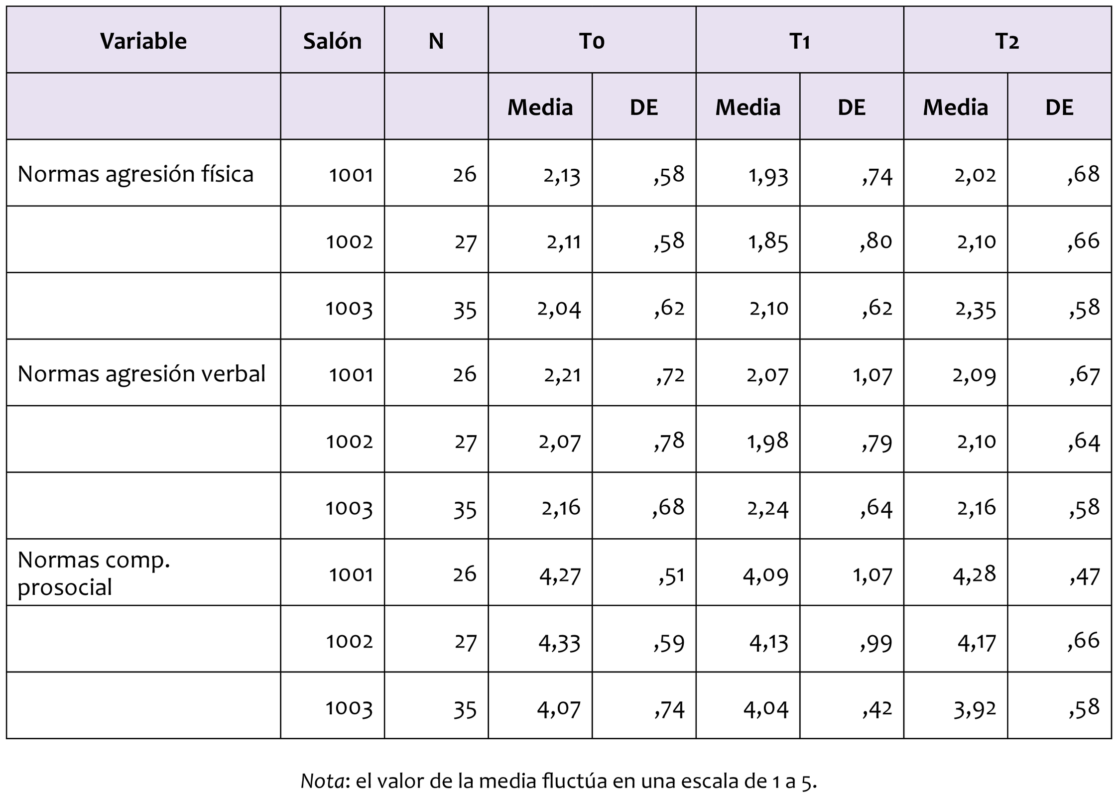 Para examinar los cambios que se dieron en la percepción de los estudiantes sobre qué tan aprobados o desaprobados son ciertos comportamientos por parte de su grupo de compañeros del aula de clases, se analizaron las estadísticas descriptivas de las normas sobre agresión física, agresión verbal y prosocialidad a lo largo de las tres tomas de datos de este estudio (ver resultados descriptivos en la tabla 2). Como se observa en las figuras 4, 5 y 6, los resultados son bastante disímiles para cada salón. En el caso de la agresión física, en el salón 1 tienden a aprobar menos este tipo de conducta después de la intervención; en el salón 2 no se observan cambios entre la línea de base y la medición final, y en el salón 3 hay mayor aprobación después de la intervención. Para la agresión verbal, en el salón 1 se observa una menor aprobación de esta conducta, mientras que en los otros dos salones no se observan cambios entre la línea de base y la última medición. Por último, en el caso de la prosocialidad, en el salón 1 no se observan mayores diferencias entre la línea de base y el resultado final, mientras que, para los otros dos salones, parece haber una menor aprobación de esta conducta al terminar la intervención. La heterogeneidad de los resultados entre los salones no permite extraer conclusiones acerca del impacto de la intervención en las normas percibidas.