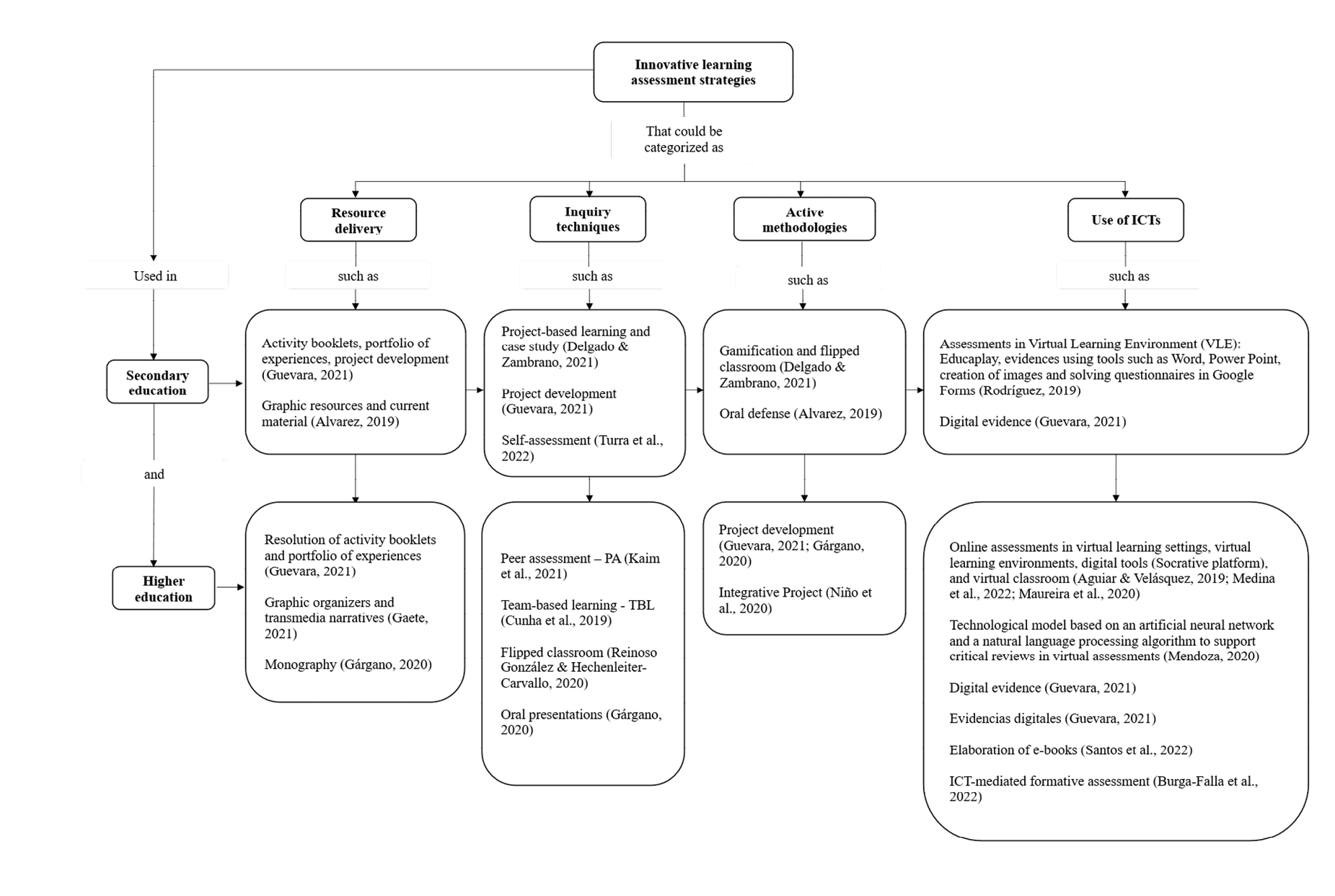 Next, we will describe the innovative learning assessment strategies implemented in secondary and higher education and detail the benefits reported by the authors after applying them. Finally, we will present a synthesizing scheme that specifies the strategies implemented, grouped according to their characteristics, and classified according to the educational level.