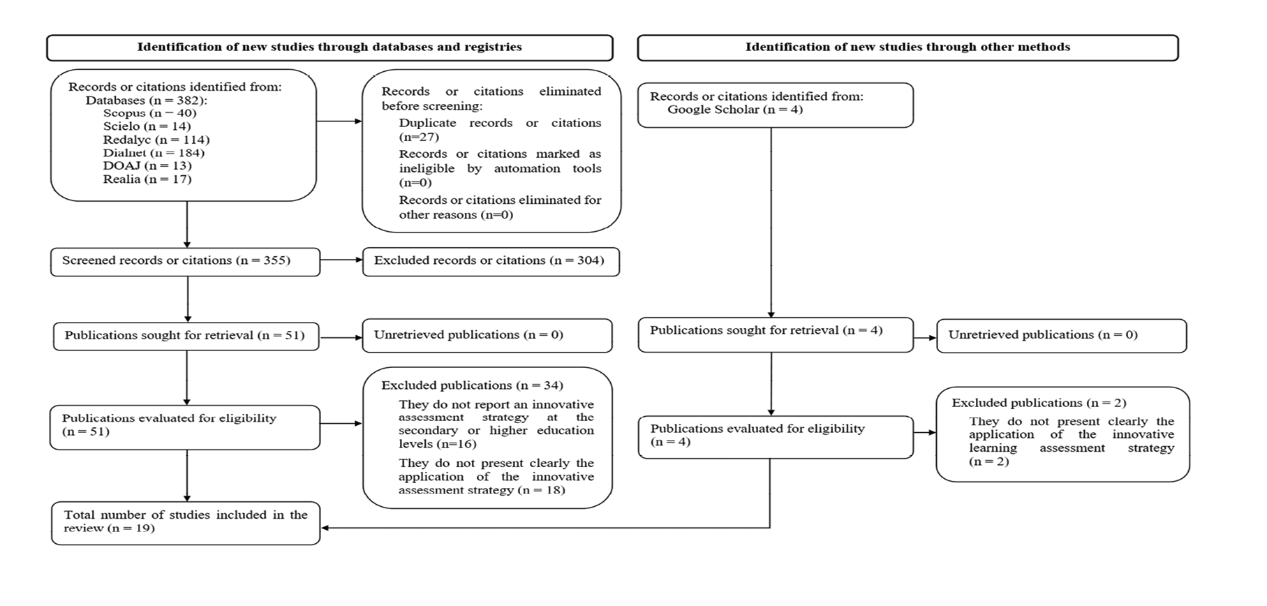 Finally, 19 studies presenting innovative learning assessment strategies were selected. The selection of documents relevant to this study was based on the following inclusion criteria: articles in databases with a publication date between 2018 and 2023, available in full text, referring to the implementation of innovative learning assessment strategies at the secondary and/or higher education levels in Latin American countries.