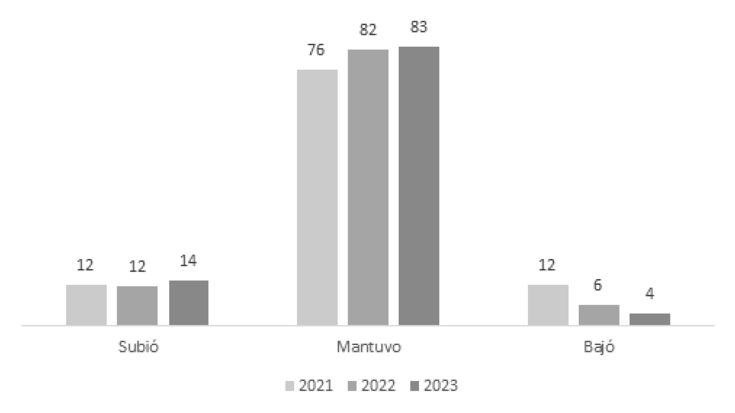 Al comparar el porcentaje de colegios que subió, mantuvo o bajó su categoría, se identifica una tendencia al mejoramiento entre 2021 y 2023, logrando que más instituciones suban su categoría o la mantengan y disminuya el porcentaje que baja su categoría (véase la figura 18).